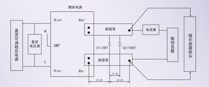 輸出紋波和噪聲是指疊加在輸出直流上交流成份,其中紋波是疊加在輸出直流上開關(guān)頻率的諧波分量,而噪聲電 壓是與開關(guān)頻率無關(guān)的非周期的分量。測試紋波和噪聲應(yīng)在規(guī)定的帶寬內(nèi)測試,一般用20MHZ帶寬,超20MHZ帶寬 的示波器可選用20MHZ帶寬限制,噪聲、紋波測試一般用mVp-p表示,測量時應(yīng)采用摸擬示波器選擇適當(dāng)?shù)牧砍?,?描速度應(yīng)低干0.5秒,測峰-峰值雜音電壓,接線如圖